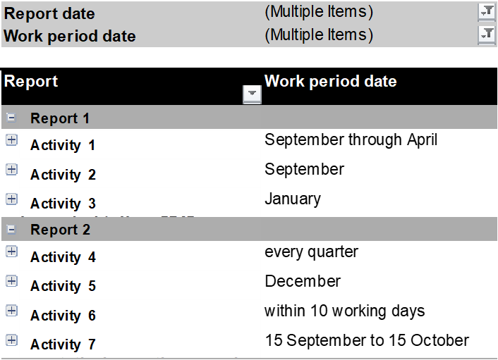 2. Concise overviews: Report dashboard for the Technical Manager. In this case we are talking about project reports and expectation management. It’s very hard to plan resources and feed back plausible completion times when you don’t have a clear insight into when your input data will come in. We needed a clear overview of what report to expect when and what high level the content would be. So, I made a dashboard once more using Power Query and PivotTables showing which reports were expected in the current period and what was coming next. Evaluating the contractor’s reports therefore became smoother with fewer surprises.