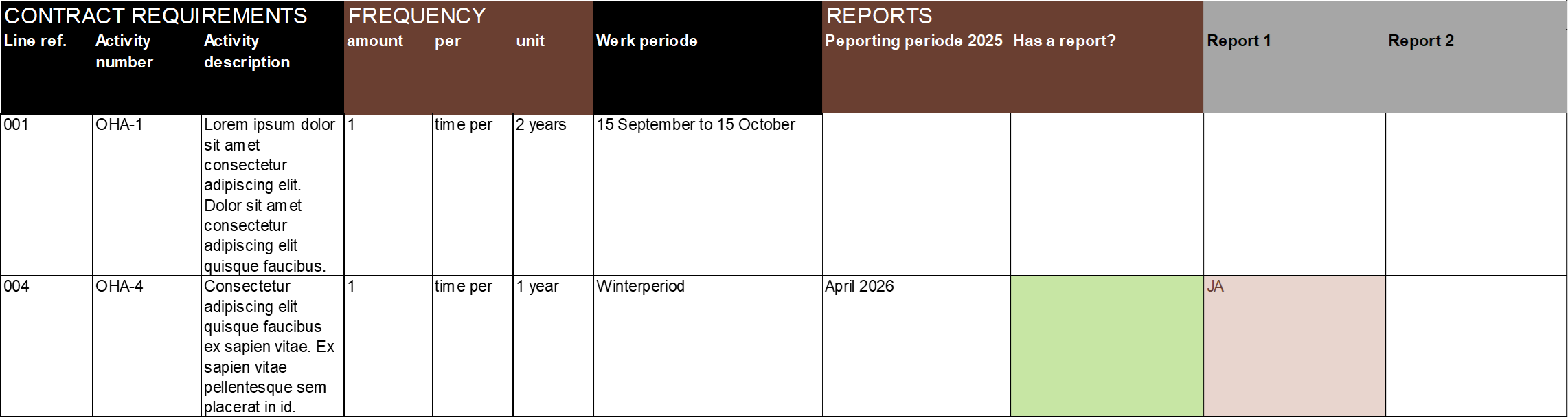4. A clear course of action: baseline comparison. Clarity was required on the expected execution dates for maintenance. Particularly the difference between contract dates and current progress updates needed to be clear. Activities of the contract requirements that the Contractor must fulfil were not visible next to real progress in the schedule, therefore the Project Control Manager and Technical Manager had no comparison points. To begin, I started with making a table out of the contract requirements.